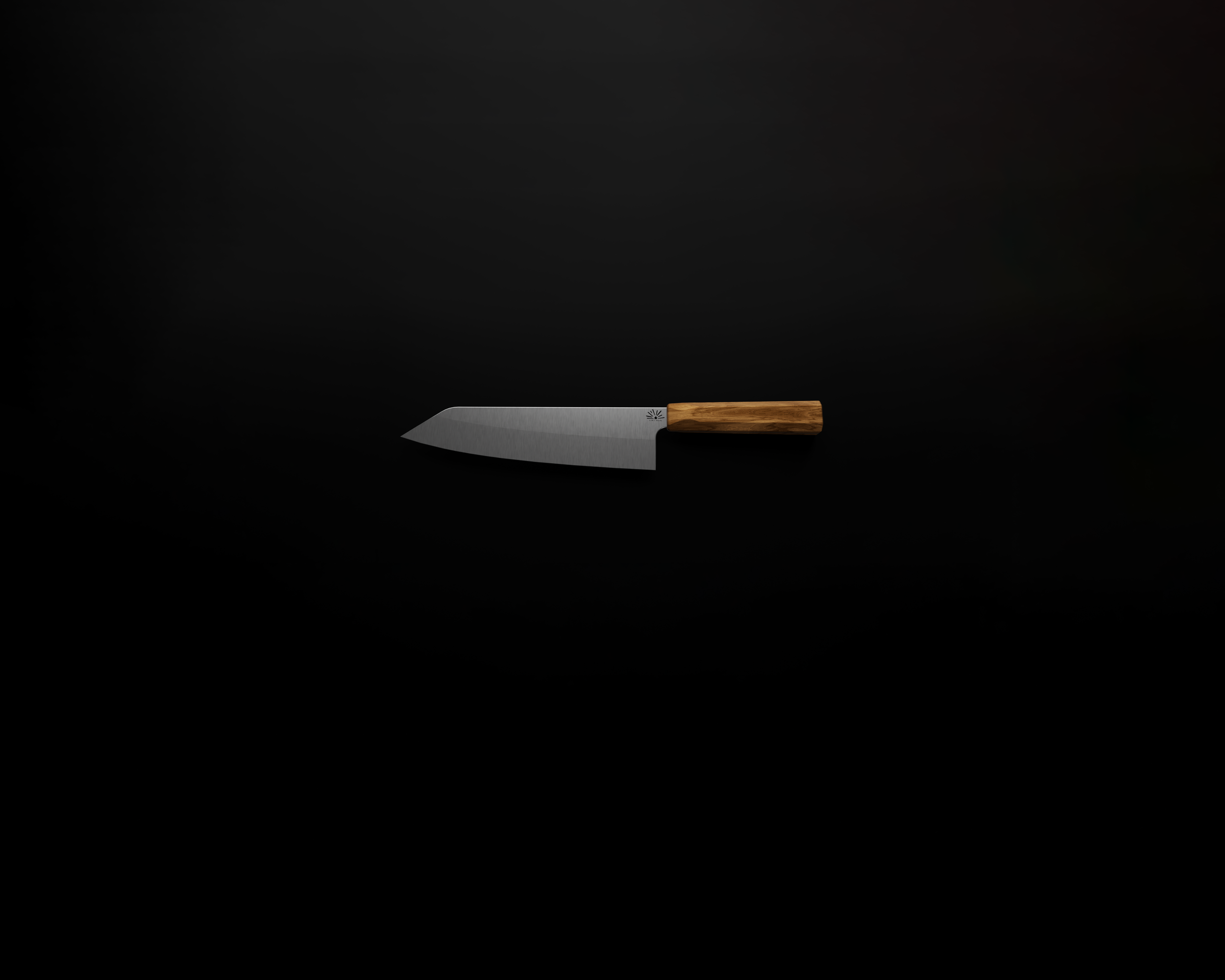 Blade shape- hybrid Japanese and German shape with fairly flat belly (ideal for push and pull chopping) and enough curve near the tip to comfortably rock chop